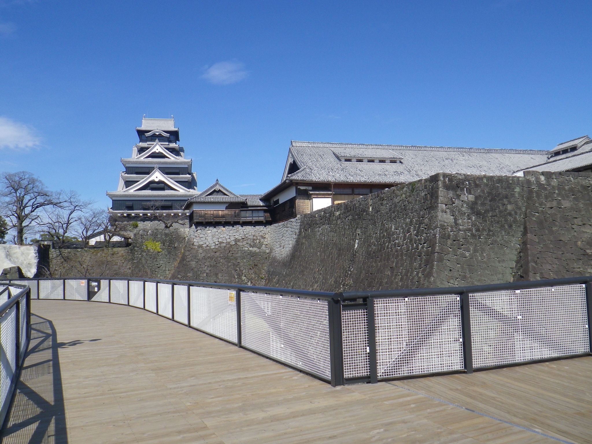 熊本城位於熊本市中心。 它是一座歷史悠久的城堡,由著名將軍加藤清正於1607年(慶長12年)竣工,因其規模和威嚴而被列為日本三大城堡之一。 熊本城擁有各種為戰爭而設計的防禦功能,被稱為「武者歸還」的石牆尤其以其石牆而聞名,越往上越陡。 它在2016年的熊本地震中受損,但天守閣也於2021年3月修復(整座城堡計劃於2052年左右全面修復)。