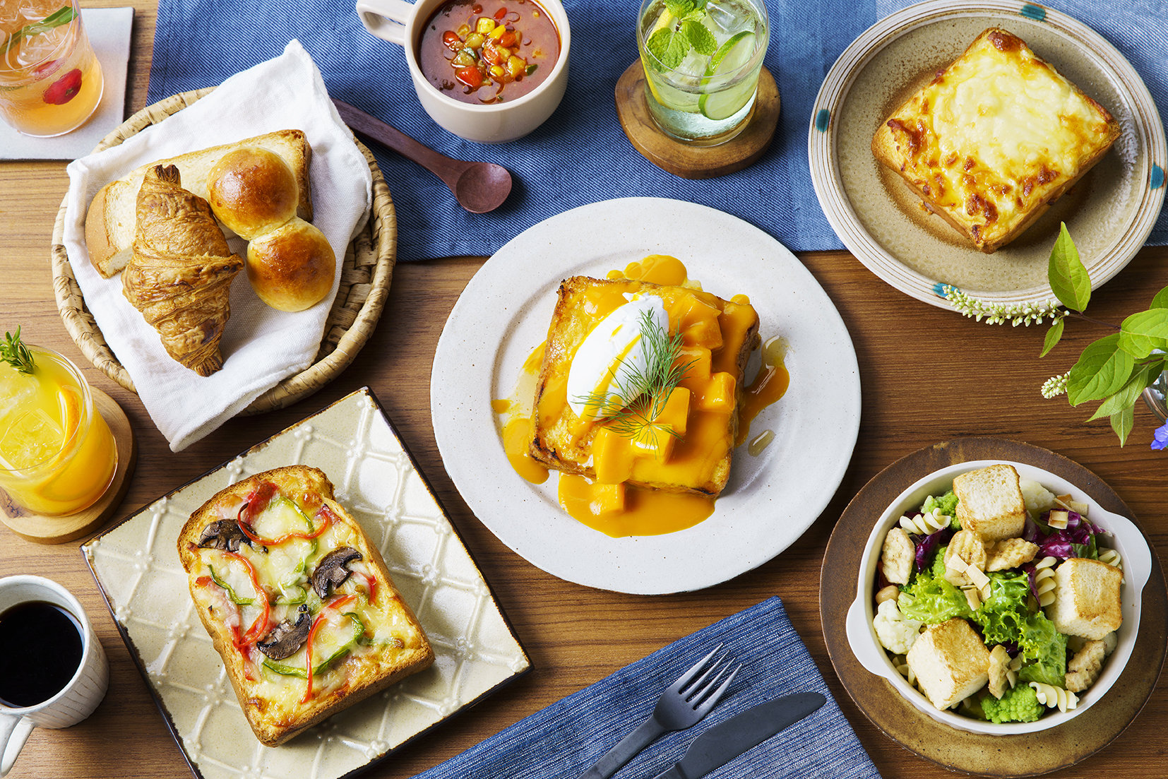 早餐有5種早餐可供選擇,包括法式三明治、法式吐司和披薩吐司(JPY1250附沙拉球、湯和免費飲料)。 法式吐司是用奶油蛋捲製成的,外酥內濕,配上芒果醬和微甜的鮮奶油。 店內陽光明媚,看起來可以精力充沛地開始新的一天。