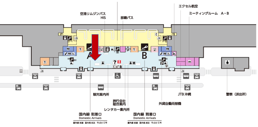 ■那霸機場國內線飛行區1樓到達大廳 *OAS航空櫃檯(紅色箭頭)