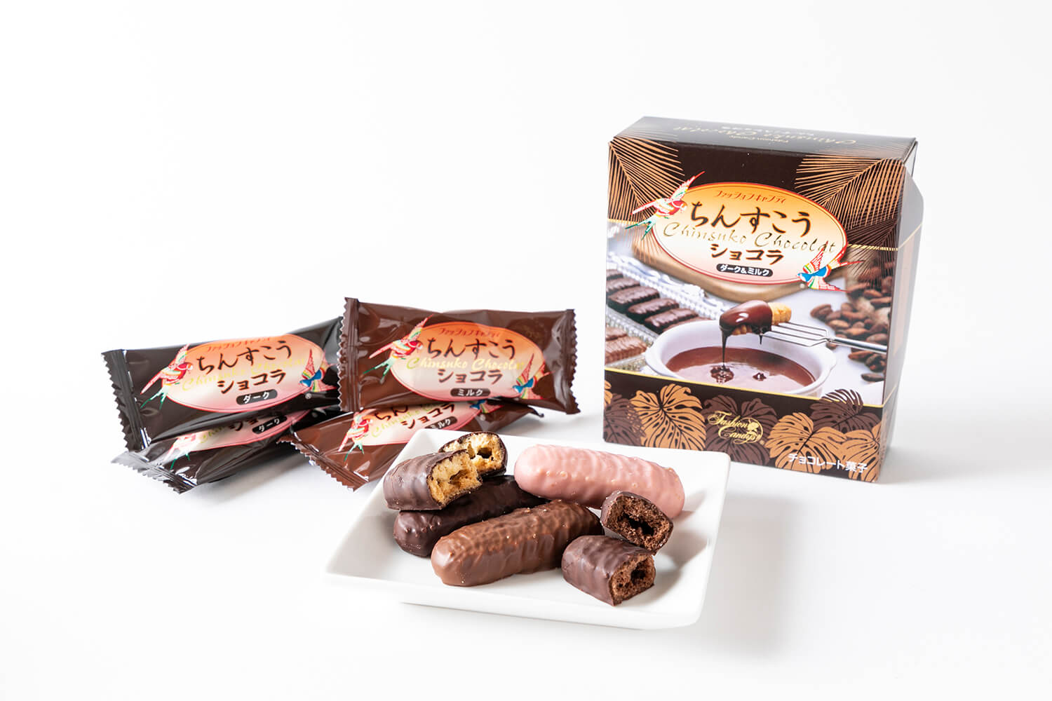 「Chinsuko Chocolat」是一種巧克力塗層的chinsuko,大約20年前由一家巧克力專賣店的時尚糖果開發。 chinsuko 的甜度較低,可以襯托出巧克力的甜味,而且內部是空心的,所以不會沉重,口感酥脆。 另一方面,巧克力也與chinsuko相配,入口即化,口感順滑。