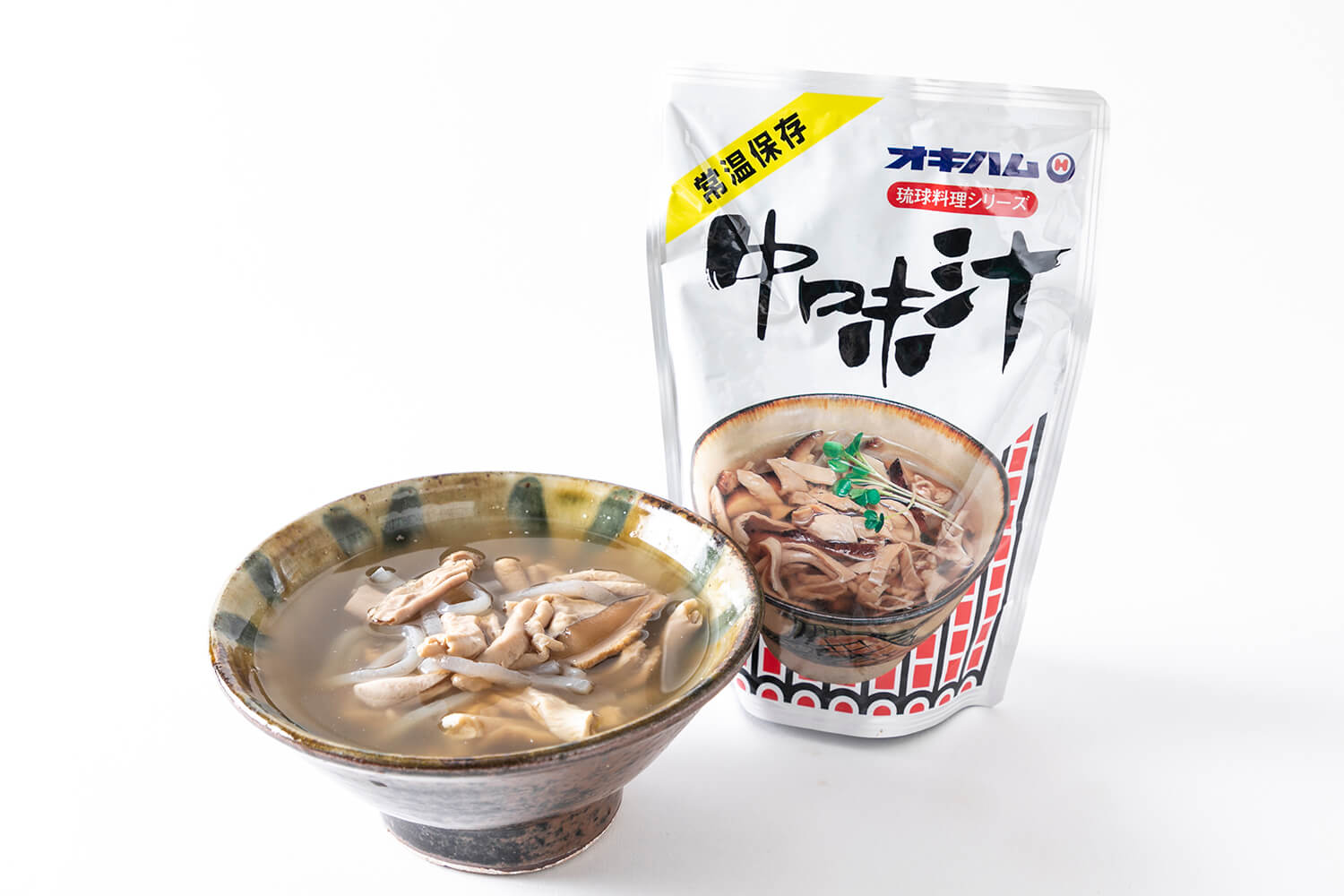 在沖繩,有一種大量吃豬肉的文化,據說豬肉「除了尖叫聲什麼都吃」,因為豬肉被用來烹飪。 豬的內臟器官,如大腸、小腸和胃,稱為「中神」,而「中神湯」只需以鰹魚湯作為餡料,是新年等慶祝活動中不可或缺的當地菜餚。