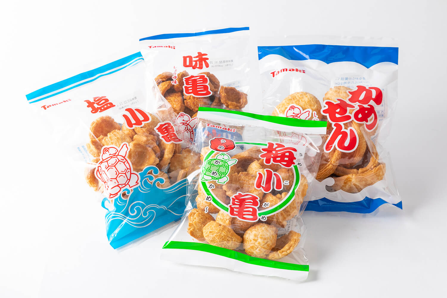 在沖繩,有個詞叫做「龜龜龜攻擊」,意思是很多食物都搭配「龜」(吃)。 「龜仙」這個含義的商品,自昭和51年推出以來,在沖繩已經流行超過45年。 有用麵粉為基底麵團用傳統方法炸製的米餅、看起來像龜殼的大型龜殼,以及容易食用的小龜殼。