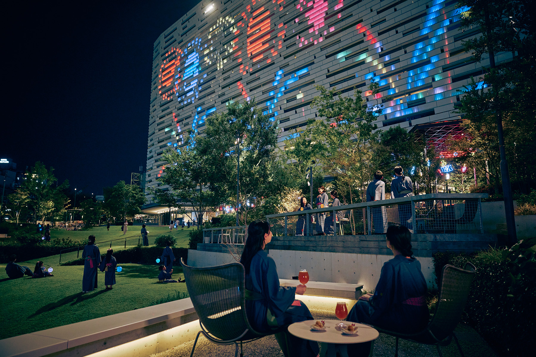 在「宮倉林」花園區,每晚都會舉辦專為飯店客人舉辦的活動。 受大阪啟發的霓虹藝術被上色,飯店外景上綻放著色彩繽紛的燈光煙火。 鄰居們的章魚燒和精釀啤酒也有供應。